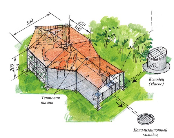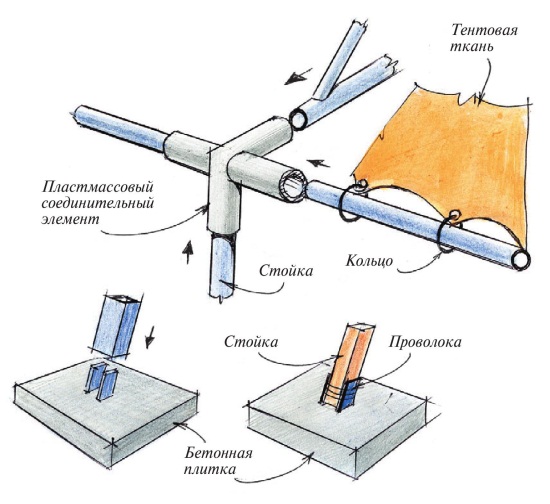 Каждый вид труб может быть использован для опор. Наиболее востребованы для навеса опоры диаметром от 20 мм, высотой 250 см. Они, так же как и деревянные стойки, опираются на бетонные блоки или плиты. Между собой стойки соединяются продольными и поперечными металлическими стержнями (внизу и вверху). Поперечные соединения конструируются в виде пространственных фермочек, образуя жесткий каркас для навеса и легких боковых стен. В свою очередь стены, выполненные из листов поликарбоната или фанеры, крепятся к металлическому каркасу при помощи болтовых соединений. Трубы окрашиваются нитроэмалевыми красками, цвет которых зависит от цвета навеса.