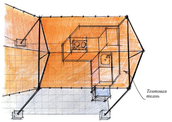 Для ограждения помещения столовой часто используют плотную тентовую ткань спокойных или ярких цветов. Она притягивается к вертикальным стойкам и горизонтальным направляющим. Размеры полотна 150 х 200 или 150 х 180 см. Для крепления применяют специальные пластмассовые кольца. Они притягивают полотно к стойкам и горизонтальным направляющим. Чтобы ткань хорошо держалась, по краю кромки ткани по всему периметру полотна прорезают сквозные отверстия (5 на 1 пог. м). В них вставляют металлические или пластмассовые кольца, благодаря им ткань не рвется даже при сильных порывах ветра.