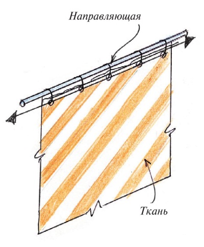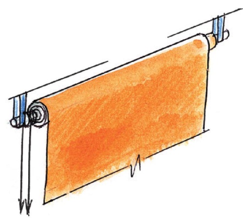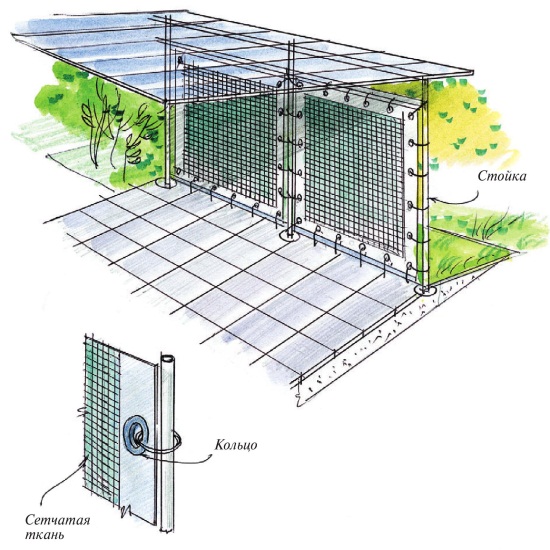 Другой конструктивный вариант, в котором материалом для изготовления также служит декоративная ткань, представляет собой штору, скрученную в трубку шириной 100–120 см, которая размещается под навесом на высоте 180–200 см. С помощью шнура ткань раскручивается вниз, где ее можно закрепить скобами, установленными в полу площадки. Если площадка превышает ширину шторы, то для ее защиты берут несколько полос штор, соединяя их в одно полотно.