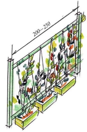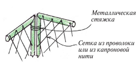 Наиболее популярны и просты в изготовлении конструкции прямоугольной и квадратной формы. Каждый такой элемент собирается из двух горизонтальных и двух вертикальных трубок (алюминиевых или стальных). Стальные трубки соединяются в единую конструкцию при помощи сварки или на болтах. При соединении болтами используют металлическую пластину в виде треугольников. Каждый из них стыкует вертикальную и горизонтальную трубку или полосу из уголкового профиля. Готовая геометрическая фигура служит каркасом для крепления сетки из проволоки или капроновой нити. Для крепления сетки в трубках просверливаются сквозные отверстия. Проволока или нить может создавать простой рисунок, состоящий из квадратных, ромбовидных ячеек размером 10 х 10 см.