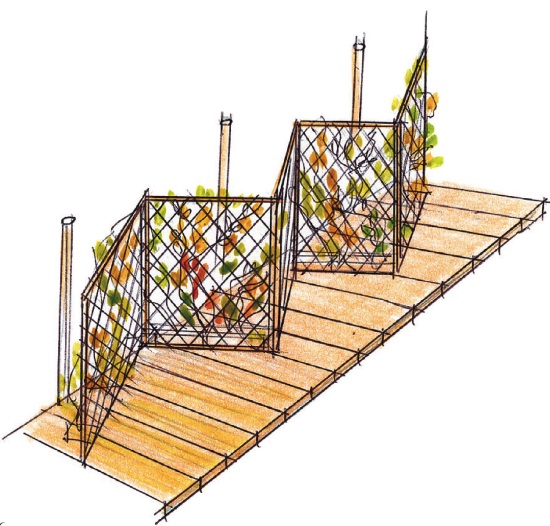Как правило, стационарные или мобильные щиты-экраны имеют либо квадратную, либо прямоугольную форму. Они крепятся к опорам (шаг опор 250–300 см, высота 200–250 см). Мобильные экраны делаются высотой не более 200 см, шириной 150 см, что позволяет перемещать их с одного места на другое. Допускается, в зависимости от конструктивных особенностей и декоративного оформления, монтировка экранов из треугольных щитов. Они соединяются между собой, образуя красивую декоративную стенку, обвитую вьющимися растениями. Не исключаются варианты использования опор, предназначенных для покрытия кровли столовой, для крепления элементов ветрозащитных стенок.