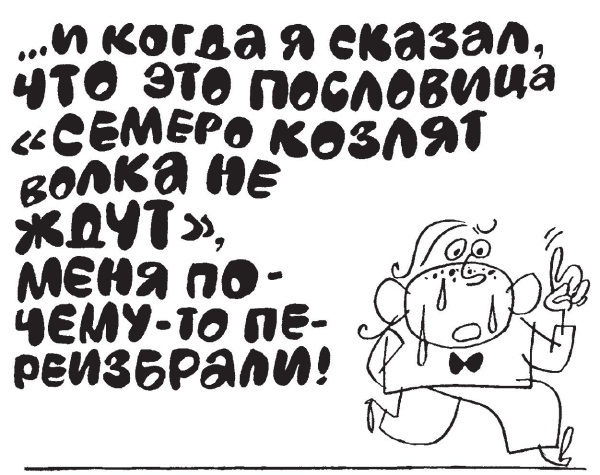 Пословицы – это народная мудрость, и чем больше их знаешь, тем мудрее становишься. В этой игре надо угадать пословицу, загаданную командой. Каждый берёт себе по слову. Например, первый – «семеро», другой – «одного», третий – «не ждут». Водящий задаёт каждому вопрос, в ответе на который обязательно должно присутствовать загаданное слово. Например, водящий спрашивает: «Что ты делал в выходные?», а игрок отвечает: «Я и мои семеро друзей ходили на речку». Водящий должен отгадать пословицу.