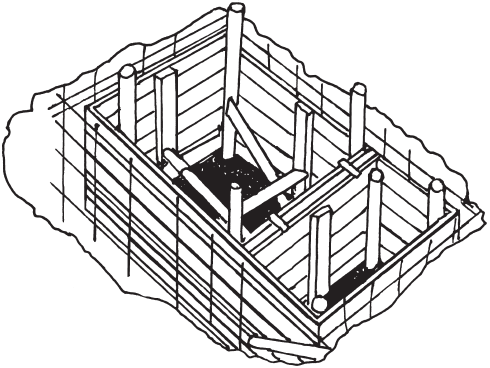 На доски настила перекрытия требуется уложить металлическую арматуру, местами прикрепить ее гвоздями к доскам. Чем больше металла будет уложено, тем прочнее и долговечнее станет крышка септика. По всему периметру в одну обрезную доску надо выставить опалубку. При устройстве ее из досок следует учитывать, что 1 м2 тяжелого бетона толщиной 20 см весит примерно 450 кг. Для большей надежности в пролетах, превышающих в ширину 1,5 м, доски необходимо подпирать по центру брусом сечением 5 х 10 см или более (рис. 20).