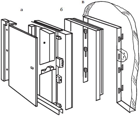 Рис. 34. Комплектация защитных дверей: а – дверь с панелями; б – коробка; в – рама