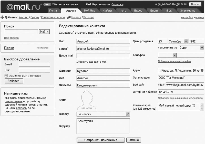 Как вы видите, мне написала моя знакомая Юлия, которая была на вечеринке и получила фотографии. Ее адреса у меня нет в адресной книжке. Нет, значит, добавим! Для этого щелкаем на ссылке в адресную книгу напротив ее электронного адреса в поле От кого. Появится окошко с анкетой, очень похожее на рис. 14.3. Заполняем его и добавляем контакт. Вот так мы будем постепенно пополнять свою адресную книгу по мере поступления писем.