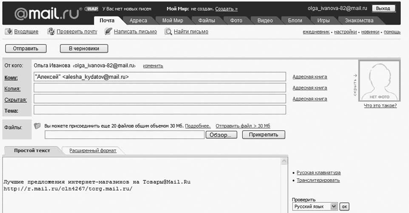 Итак, создаем новое письмо. Для этого щелкаем на ссылке Написать письмо, которая находится рядом с уже знакомой нам ссылкой Проверить почту (см. рис. 13.12). Нашли? Далее видим уже знакомый нам бланк для письма (см. рис. 14.4), только с пустым полем Кому.