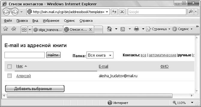 Появится новая вкладка, на которой будет находиться список ваших контактов, на рисунке он один-одинешенек. Устанавливаем напротив него флажок и нажимаем кнопку Добавить выбранные. Адрес автоматически появится в поле Кому. Теперь в поле Копия будем вносить электронные адреса остальных знакомых, которые были на вечеринке. Допустим, они нам их оставили, когда мы прощались, и попросили прислать фотографии. Набираем все адреса через запятую.
