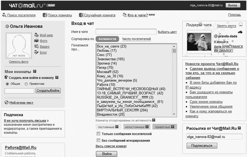 Ба! Да меня здесь знают! Как видите, регистрация на сайте дает вам доступ не только к почте, но и ко всем сервисам. «Мейл. ру» знает, что в чат вошла Ольга Иванова, и даже сразу предлагает организовать рассылку на почтовый адрес olga_ivanova-82@mail.ru (смотрите в правом нижнем углу окна).
