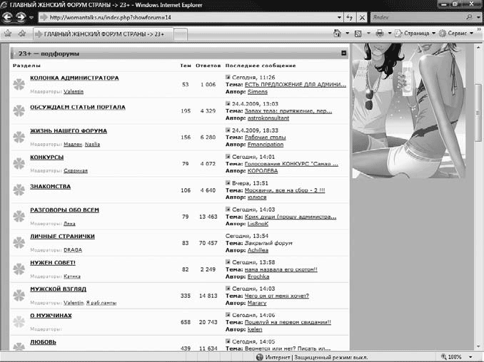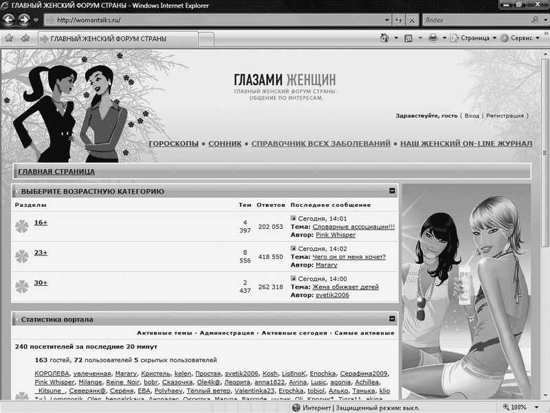 Но давайте по порядку. Выберем какой-нибудь нейтральный женский форум. Можете запустить поиск по фразе «женский форум». «Гугл» мне нашел Главный женский форум страны (womantalks.ru). Туда и пойдем (рис. 16.5).