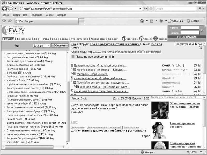 На мой взгляд, это самый неудобный из всех возможных вариантов. Слева тут расположены темы раздела. Открытый на рис. 16.11 раздел называется Продукты питания и напитки, тема Рис для плова. На экране видно только одно сообщение, остальные обозначены заголовками и открываются, если щелкнуть на заголовке. Плюс ко всему стрелочками показано, какое сообщение является ответом на основной вопрос темы, а какое – ответом на ответ… Сложная система, но при желании вы ее осилите.