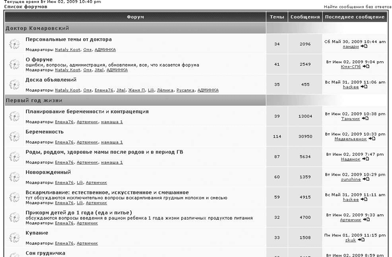 Еще один внешний вид форума, один из самых распространенных, показан на рис. 16.12. Так выглядит список разделов на форуме замечательного врача-педиатра Е. О. Комаровского .