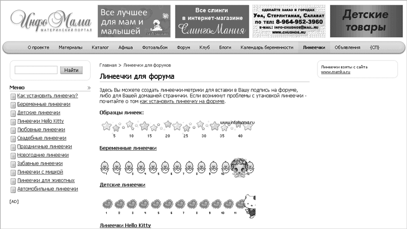 Как вставить такую линеечку? Найти специальный сайт. Запустите поиск по словам Линеечки для форума, и вы найдете их неимоверное количество. Например, на сайте http://www.infomama.ru/lines огромный выбор линеечек (рис. 16.17). Если вы щелкнете на ссылке Как установить линеечку? то прочитаете все подробности о том, что нужно для этого сделать.