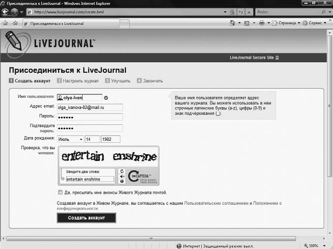Заполняем предложенную форму и нажимаем кнопку Создать аккаунт. Смотрим, что происходит дальше. Регистрация на этом сайте многоступенчатая. Это отражено в верхней части страницы. Как видно, регистрация проходит четыре стадии: создание аккаунта, настройку журнала, улучшение и заключительную стадию. На рис. 17.2 мы находимся только на первой стадии. Остальные стадии регистрации не представляют сложности, думаю, вы быстро разберетесь с ними.