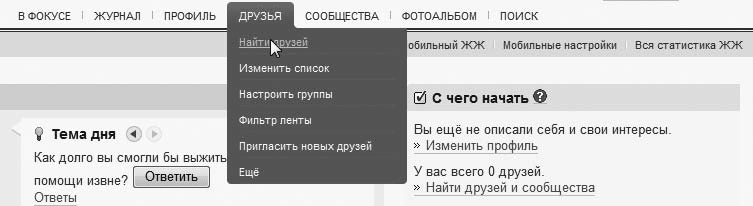 Давайте рассмотрим его. Будем двигаться не по порядку, а начнем с меню ДРУЗЬЯ (рис. 17.5). Кто же такие ваши друзья в ЖЖ? Это те пользователи, которых вы записали себе в друзья. Еще говорят «зафрендили».