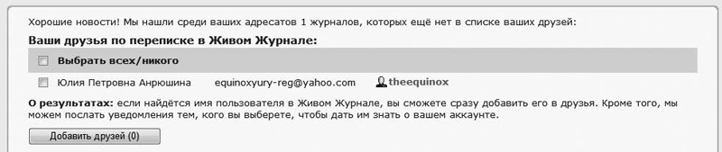 Видите, ЖЖ сам проверит, есть ли кто-нибудь из адресатов вашей записной книжки у него в базе данных. А если их нет, то ЖЖ может отправить им по почте приглашение к вам присоединиться (рис. 17.7).