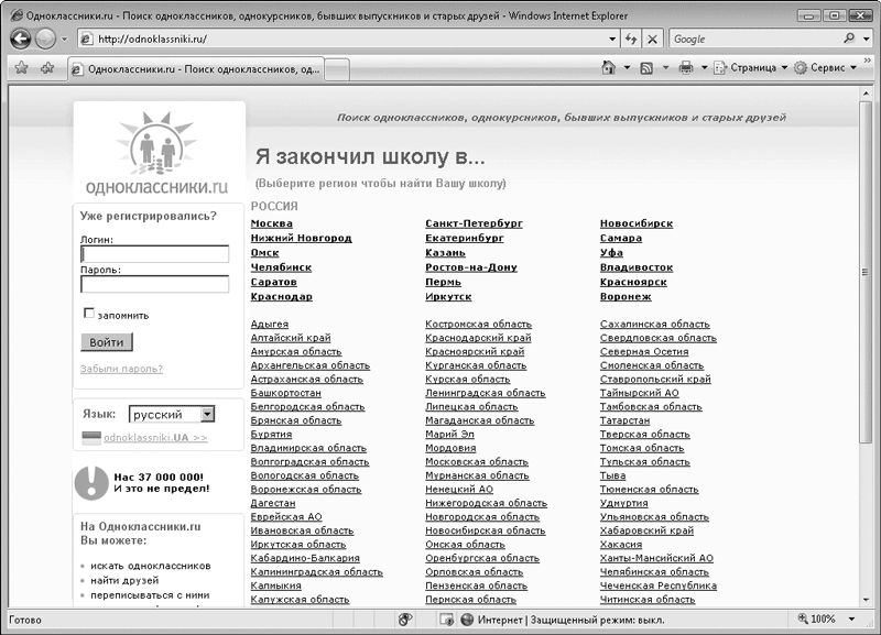 Итак, идем на сайт odnoklassniki.ru и видим перед собой следующую картину (рис. 18.1). Обратите внимание, на момент написания книги на сайте уже зарегистрировано 37 млн человек!