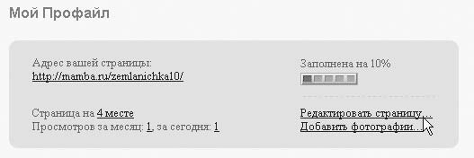 Далее примите поздравления и подтвердите e-mail, указанный при регистрации, иначе ваша анкета будет исключена из участия в поиске через сутки. Сделать это можно, перейдя по ссылке в письме, которое будет выслано вам незамедлительно. После того как загрузится страница с сообщением о том, что подтверждение прошло успешно, нажмите на ней кнопку Продолжить. Вы попадете в раздел Мой Профайл. Следующим этапом станет создание вашей страницы, где вы обрисуете себя, любимую, с самой лучшей стороны, можете не стесняться в выражениях и эпитетах: ведь все это правда. Щелкните на ссылке Редактировать страницу (на рис. 19.2 на нее наведен указатель мыши).