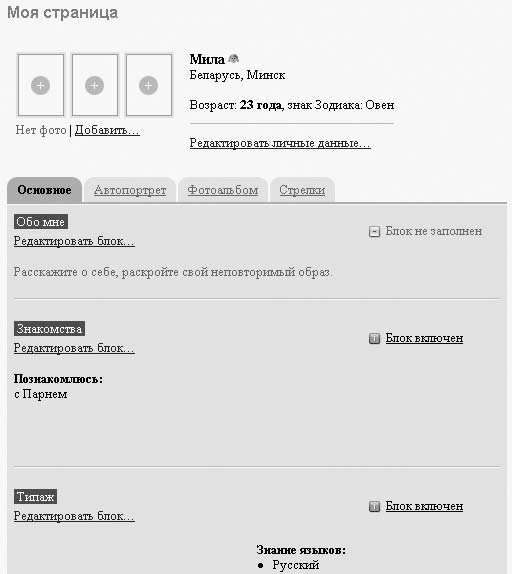 Как видите, каждому типу анкетных данных соответствует свой блок. Чтобы заполнить его, щелкните на ссылке Редактировать блок, отметьте те характеристики, которые вам соответствуют, и нажмите внизу кнопку Сохранить. Вы вернетесь на свою страницу, на которой сразу же увидите изменения. Проделать эту операцию желательно (но не обязательно) для всех блоков. Помните, что правильно заполненная анкета – залог успеха.