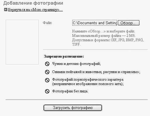 Следующий важный этап – добавление фотографии. Нажмите на своей странице ссылку Добавить (она находится под тремя прямоугольниками, в которых должны размещаться фото). В открывшемся окне (рис. 19.4) щелкните на кнопке Обзор, выберите заранее подготовленное фото и нажмите Открыть. Путь к вашей фотографии отобразится в поле Файл. После этого решительно нажимайте на Загрузить фотографию, а на появившейся странице — Сохранить. Все готово.