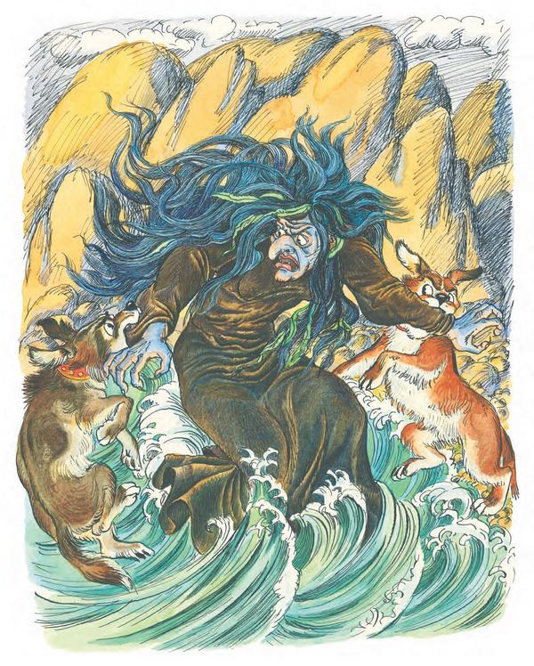 Смутилась страшная жена Горыныча: её никогда не называли красавицей. Тут подскочили к ней собаки, вцепились в рукава и потянули в разные стороны. Потянули собаки за рукава в разные стороны, и вдруг – трах-бах – из одной жены Горыныча получились две молодые девушки. Да такие на вид милые и скромные, что просто удивительно! Старший брат сразу обомлел. Тогда одна девушка подошла к камням и дотронулась до них веточкой черёмухи. Зашевелились камни на морском берегу, посыпались с них песок да пыль – и встали два брата и их собаки, живые и невредимые. Тут кинулись братья целоваться да обниматься, а потом пошли все в королевский город.