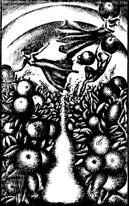 Я стоял в молчаливом удивлении. Передо мною был куст ростом с человека; листья в ладонь, а красные сочные плоды величиною с большой арбуз напоминали землянику. Это и была чудовищная земляника. Кустик не стлался по земле, а тянулся вверх. На тонком стебле висели эти огромные ягоды. (Вот что значит отсутствие тяжести). Одни из них были совершенно красные, другие еще не созрели.