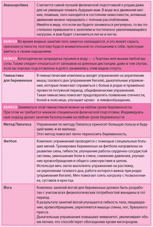 Полезные нагрузки для будущей мамыЕсли вы до беременности вели активный образ жизни, занимались в тренажерном зале, посещали бассейн, то после консультации с врачом вы можете продолжать свои занятия. Однако интенсивность физических нагрузок должна быть снижена в несколько раз. Не следует во время беременности начинать осваивать то, чем раньше никогда не занимались, за исключением специальной гимнастики для беременных, а также плавания, проводимых под наблюдением опытного специалиста – инструктора для беременных. В ряде случаев из-за особенностей течения беременности приходится существенно ограничивать физические нагрузки. А для некоторых беременных женщин занятия спортом вообще противопоказаны. Например, в случае угрозы прерывания беременности или при аномалии строения матки. Заниматься можно 3– раза в неделю. Однако даже при меньшей интенсивности тренировок следует строго соблюдать их режим. Единичные упражнения являются стрессом для организма будущей мамы и ее малыша. Обратите внимание на то, в чем вы тренируетесь. Отдавайте предпочтение одежде из натуральных тканей, которые хорошо пропускают воздух и не дают вашему организму перегреваться. Помимо этого одежда должна быть свободной, чтобы не стеснять ваших движений. Позаботьтесь также и о том, чтобы ваша обувь была удобной.