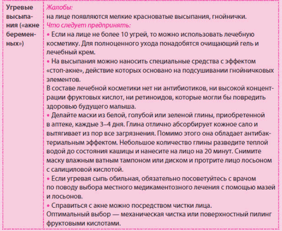 При лечении акне посоветуйтесь с врачом-косметологом. Во время I триместра у многих женщин возникает акне. Большинство обычных средств для лечения содержат вещества, которые не рекомендуются беременным. Поэтому лучше не заниматься самолечением.Рекомендуется