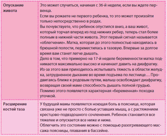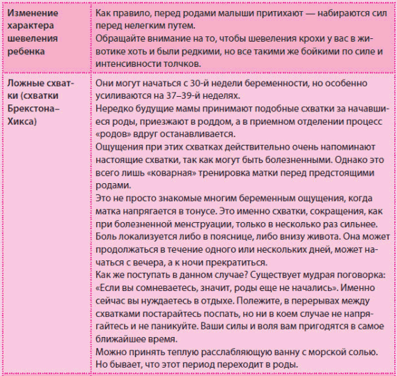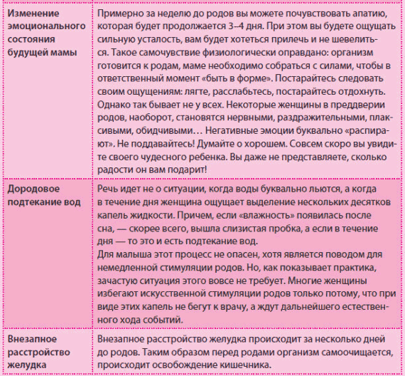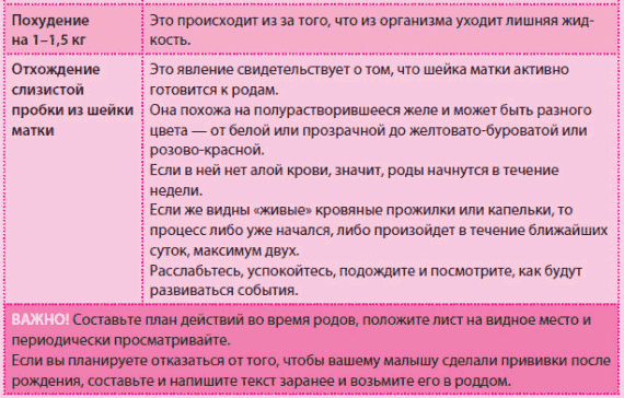 Приближается день появления на свет вашего чудесного долгожданного малыша… Имейте в виду, что после 38 недель роды могут начаться в любой день. Роды – важнейшее событие, и природа не позволяет им начаться без предупреждения. Особенно она внимательна к женщинам, которые ждут первого ребенка. О том, что приближается время родов, она оповещает их за 2–3 недели. Существуют общепризнанные сигналы, которые свидетельствуют о приближении родов, так называемые предвестники. Они выражаются как в процессах, указывающих на то, что организм готовится к родам (начиная с 32-й недели беременности), так и проявляются непосредственно перед родами.