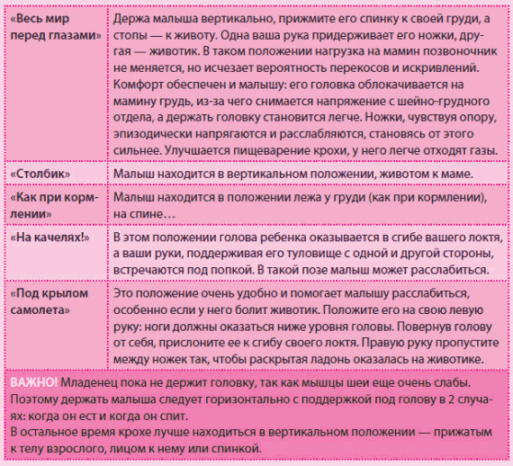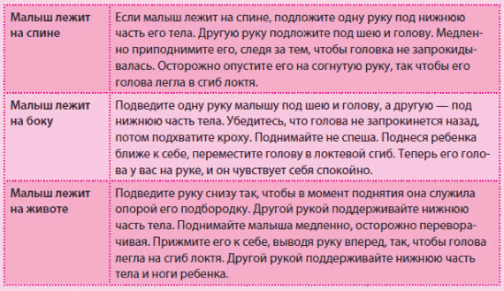 Ваша ноша – драгоценная, но весьма нелегкая, и нередко к концу дня у вас может начать болеть шея, спина. Поэтому важно сделать этот процесс комфортным и для крохи, и для вас. Держать малыша на руках можно и сидя, и лежа – что особенно актуально в первые недели после родов. Делать это надо таким образом, чтобы у него не было ни малейшего шанса упасть, удариться, обжечься. Особенно это важно, когда вы двигаетесь, держа ребенка на руках.