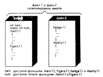 Вы можете также описать статические переменные вне любой функции. Это создаст "внешнюю статическую" переменную. Разница между внешней переменной и внешней статической переменной заключается в области их действия. Обычная внешняя переменная может использоваться функциями в любом файле, в то время как внешняя статическая переменная может использоваться только функциями того же самого файла, причем после определения переменной. Вы описываете внешнюю статическую переменную, располагая ее определение вне любой функции.
