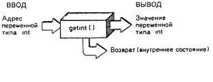 Нашу функцию getint можно представить себе (рис. 10.2) как имеющую один вход и два выхода. На ее вход поступает адрес целой переменной, значение которой считывается. На первом выходе имеем значение считанного целого, полученного через указатель. (Таким образом, аргумент-указатель является двусторонним каналом передачи информации.) На втором выходе получаем код состояния, что обеспечивается функциейreturn. Отсюда следует, что "скелет" нашей функции должен выглядеть примерно так:
