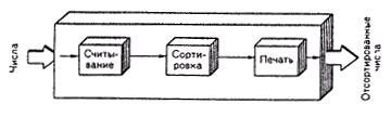 Теперь мы имеем три черных ящика, каждый со своим входом и выходом. Можно передать каждую часть разным группам программистов, если мы уверены в том, что числа, выводимые блоком "считывание", представлены в той же самой форме, которую использует блок "сортировка" для ввода.