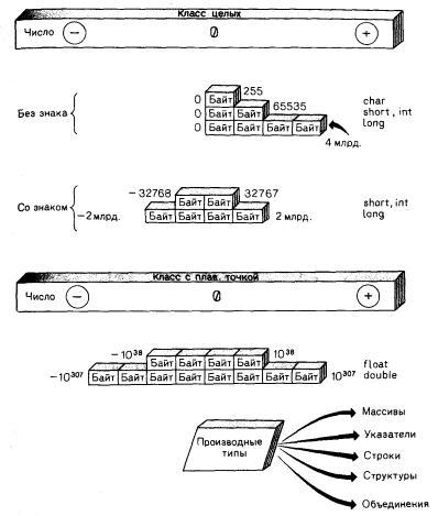 В языке Си имеются и другие типы данных, построенные с использованием основных типов. Они включают в себя массивы, указатели, структуры и объединения. Хотя эти типы являются пред метом рассмотрения последующих глав, мы, не подозревая об этом, уже применили указатели в примерах, приведенных в данной главе. [Указатели используются функцией scanf; признаком этого в данном случае служит префикс &.]
