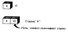 Необходимо заметить также, что строка "х" не то же самое, что символ 'x'. Первое различие: 'х'– объект одного из основных типов (Char), в то время как "х"– объект производного типа (массива элементов типа char). Второе различие: "х" на самом де ле состоит из двух символов - символа 'x' и нуль-символа.