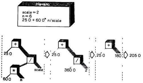 Многие программисты предпочитают представлять порядок вычислений с помощью диаграммы специального вида, называемой "правом выражения". Ниже приводится пример такой диаграммы. Диаграмма показывает, как исходное выражение сводится к одному значению.