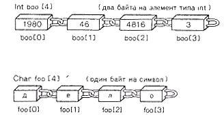 РИС. 8.7. Размещение в памяти массивов с элементами типа char и int