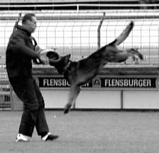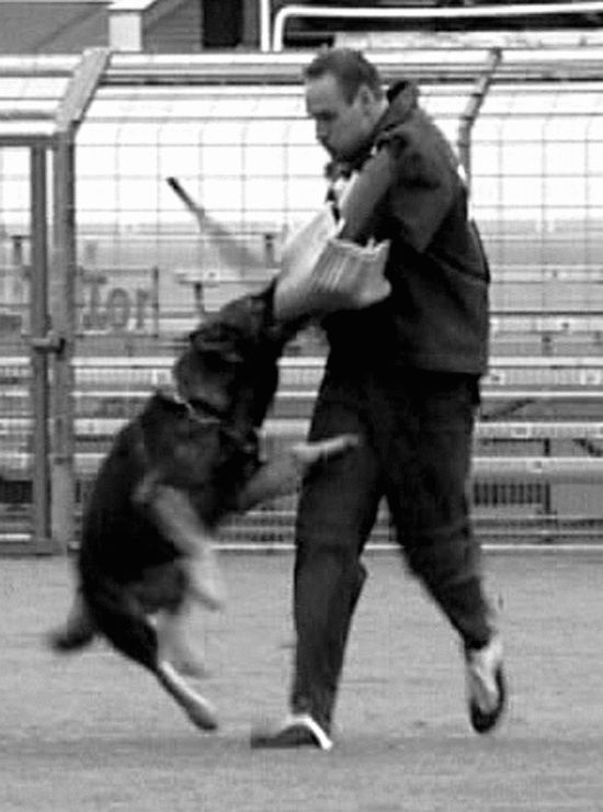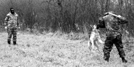Фигурант с открытым стандартным рукавом во время лобовой атаки фронтально принял собаку на уровне груди, не смягчив ее прыжок, а, наоборот, продолжив движение навстречу врезавшейся в рукав собаке, в результате этого произошел удар на противоходе. Ситуацию усугубило и то, что во время броска пес попал задними лапами в небольшую канаву. Все проходило на очень высокой скорости, и фигурант, мастер спорта по самбо, и сам рабочий кобель неслись друг к другу с большим ускорением. Собаку сложило в воздухе после жесткого удара, но травмированный пес хватку не бросил и продолжал бороться с нападающим. Так как расстояние до них было около ста метров от основной группы, проводник только через какое-то время смог дать команду на прекращение борьбы и сброс рукава фигуранту. Травмированный пес тут же лег около рукава и перешел в фазу охраны. Потрясающая собака! А вот дальше возник резонный вопрос — КТО ВИНОВАТ? Мнения присутствующих разделились. Но суть в другом. Уважаемый читатель, возникла преобладающая версия о том, что собаку неправильно приняли. Не спешите после моего описания делать выводы, давайте расставим точки над i. Я не зря столько времени уделил этому кобелю, повторюсь, РАБОЧЕГО РАЗВЕДЕНИЯ! Этих собак разводят, исключительно опираясь на качества, необходимые в их будущем РАБОЧЕМ использовании, причем преобладающими инстинктами для отбора являются инстинкты добычи, борьбы и защиты. В этом случае как можно говорить о правильности или неправильности приема?