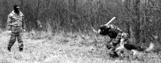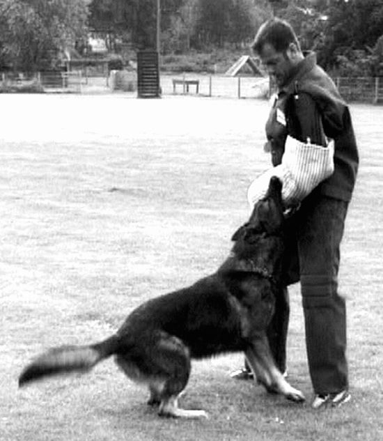 В холодный ноябрьский день возле крепостной стены в живописнейшем месте Смоленска проходило очередное занятие Сергея с владельцами немецких овчарок. Вся интрига заключалась в том, что именно в этот день должен был присутствовать его кобель-немец, вывезенный из словацкого питомника рабочего разведения и впоследствии ставший призером чемпионата России по IPO-3 (испытание пользовательских собак). А для справки, в Чехии и Словакии была очень хорошая маточная база, сильные воспитатели собак и хорошие амбиции у заводчиков рабочих питомников. Хороший спортсмен и прекрасная собака! Я, естественно, загорелся желанием с помощью своих друзей, которые ходят под моих «немцев» и имеют определенный опыт работы с собаками, протестировать этого великолепного пса, а то ведь порой как бывает: на хозяйский рукав идет, как снаряд из пушки, а против жесткого стороннего фигуранта сразу скисает! Предварительно узнав у Сергея, держит ли его кобель удары ногами, и получив утвердительный ответ, мы стали расспрашивать, что еще можно делать, а чего нельзя во время работы с собакой. Ответ спортсмена был краток и лаконичен: «Делайте, что хотите!» Как говорят в армии, «Команда дадена — деревня будет взядена». После небольшой работы на привязи, с жестким скрытым рукавом, с тестами, несложными для такого уровня подготовки, а именно: нашагивания на собаку (когда задние ноги волочатся по земле, и собака не чувствует опору и натяжение рукава), замахи, крики, несильные удары ногами в область спины и живота — пришли к выводу, что все у пса было в порядке!