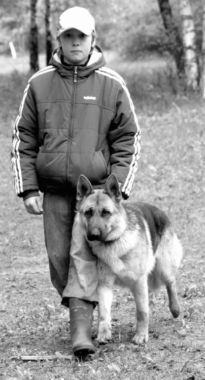 Ребенок с утра до вечера носился с соседскими мальчишками по окрестным полям и лесам. Случаев пропажи детей в тех местах не припоминали, но впечатлительная бабушка вышеописанный эпизод приняла очень близко к сердцу. Одним словом, надо было подготовить охранную собаку для маленького мальчика. Кстати, проблемы, с которыми мы столкнулись во время тренировки боевого пса, заставили меня крепко задуматься о написании соответствующей книги. Действительно стоящего наставления найти так и не удалось. Пройдя путь от начала до конца, мы выдали очень впечатляющий результат. Немецкая овчарка непонятного происхождения работала на реальной защите выше всяких похвал. Даже сейчас, спустя три года, мои друзья, которые ходили под этого кобеля, вспоминают его с благоговейным ужасом и почтением. Хорош «бродяга»! Самое важное, что мы наработали соответствующими тренировками, — это лютая ненависть и недоверие ко всем посторонним, будь то мужчина или женщина. В окрестных деревнях уже знают, что когда идет мальчик со своей собакой, лучше не делать резких движений и не подходить к нему ближе чем на 3 м.