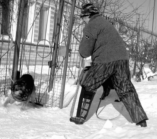 На начальных этапах наработки этого навыка я рекомендую ставить собаку в некий П-образный коридор шириной не более 3 м, чтобы ограничить пространство для маневра. Учтите, что грань между уходом от удара с возобновлением атаки на противника и уходом от удара для избегания конфликта, то есть трусостью, очень тонка. Поэтому надо создать такие условия, чтобы максимально сузить варианты решения собакой этой задачи. Она должна ясно и четко представлять, что только уход с последующей атакой является единственным условием победы. Вот в этом и состоит ваша основная задача.