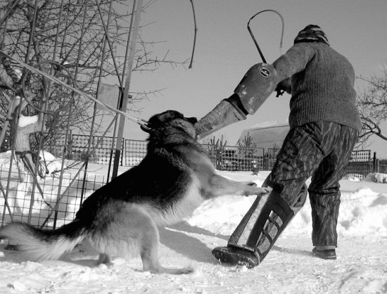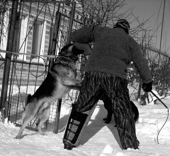 Приведу очень интересный пример, описанный в книге С. Козлова, посвященной героической истории спецназа ГРУ ГШ МО СССР. В середине 70-х гг. прошлого столетия проводились крупномасштабные учения войск стран Варшавского договора. По условиям противостояния красных и синих, как назывались условные противники, небольшая группа советских спецназовцев под командованием старшего лейтенанта Л. должна была преодолеть границу между СССР и Польшей. Существовала устная договоренность между сторонами о том, что при преследовании польскими пограничниками наших бойцов не делаются пуски собак. Видимо, увлекшись погоней или просто желая лишний раз потренировать на «живца» своих овчарок, поляки условия договора забыли. Когда в лесу до группы советского спецназа оставались считанные километры, погранцы сделали пуск двух собак. Естественно, бежать, чтобы быстрее снять овчарок с жертв, никто не собирался, да оно и понятно: боишься — не делай, а делаешь — не бойся. Справедливо рассудив: мол, на войне, как на войне, — преследователи неспешной трусцой преодолели искомый отрезок пути и вышли на поляну. Глазам пограничников предстала ужасная картина. Одна собака была зарезана, а вторую подвесили на сук дерева за ошейник, предварительно задушив. Все правильно: за что боролись, на то и напоролись. Деморализованные стражи границы прекратили дальнейшую погоню и с рыдающими проводниками, несущими своих павших четвероногих товарищей, возвратились к месту постоянной дислокации. Конечно, действия советских солдат не способствовали дружбе народов, зато дали возможность беспрепятственно выполнить поставленную задачу. После окончания учений польская сторона изъявила огромное желание пообщаться с командиром группы спецназа для установления подробностей картины происшедшего. Каково было удивление поляков, когда старший лейтенант заявил, что он в одиночку расправился с подготовленными овчарками, оставшись для прикрытия основной группы. Пограничное командование не поверило столь дерзкому и самонадеянному заявлению спеца, на что он предложил сделать пуск еще двух собак, если не жалко животных. От повторного эксперимента польская сторона благоразумно отказалась. Мне думается, что сам рассказ Сергея Козлова более чем наглядно подтверждает истинность моего убеждения в необходимости обучения собаки избегать удара с последующим возобновлением атаки, а также делать хватку в ближайшую точку.