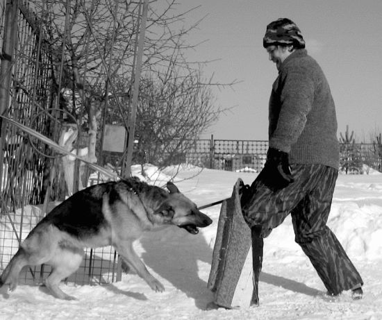 Собака на короткий метровый поводок привязывается к забору. Фигурант, надев на одноименные руку и ногу соответствующие элементы защиты, начинает из укрытия движение к животному, всячески демонстрируя агрессивный настрой. Он останавливается в метре от собаки. Ударами стеком по рукаву и щитку на ноге заводит ее. Затем по касательной, как это было в методике с рукавом, начинает движение в сторону животного. Нога в щитке отставляется в сторону собаки; если она не реагирует, то защищенной ногой следует нанести по ней несильный удар. Задача помощника — переключить животное на нижнюю конечность. При отсутствии вариантов достать руку собака быстро поймет, что для выплеска собственной злобы подойдет и подставленная нога. Со временем атака по касательной сменяется на фронтальную. Можно также вводить и несильный удар ногой навстречу атакующей собаке. После усвоения курса со щитком переходят к занятиям в дрессштанах. Поводок удлиняем до трех метров. И во время нападения на животное подставляем ему под укус район не только голени, но и бедер. В идеале животное должно делать хватку за внутреннюю часть бедра. Место очень болезненное, хороший укус в эту область моментально выводит противника из строя. Даже весьма опытные фигуранты, годами работающие с собаками, не успевают среагировать на молниеносный бросок в бедро. Для человека положение усугубляет и тот факт, что в этом месте проходит основная артерия, ее повреждение приводит к быстрой кровопотере и, как следствие, к смерти.