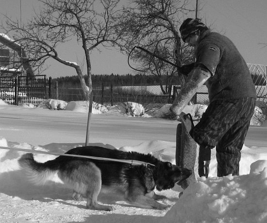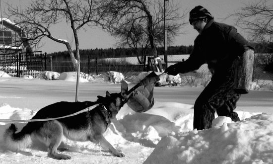 Так как усвоение этого элемента является неким продвинутым этапом в нашем обучении, то к нему приступают лишь в том случае, когда собака усвоила и хорошо изучила курс противостояния с одним человеком.