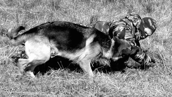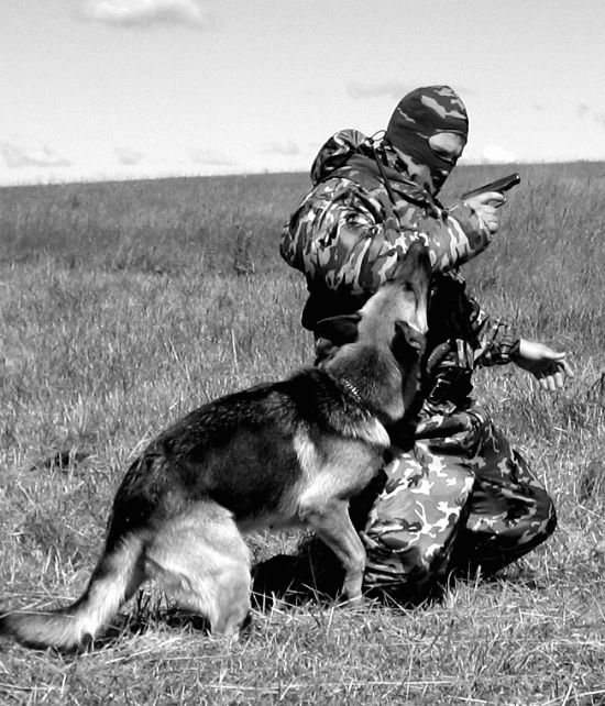 После успешного выявления возможных мест для засады приступаем к отработке контрдействий в случае нападений на вас или членов вашей семьи. Вариантов множество, но все они укладываются в схему атаки внезапной, демонстративной или скрытой; в близком контакте или на удалении. В первом случае все достаточно просто, ведь ничего нового по сути для собаки не происходит. Во втором же ей надо самой распознать угрозу и предотвратить нападение. А это гораздо сложнее.