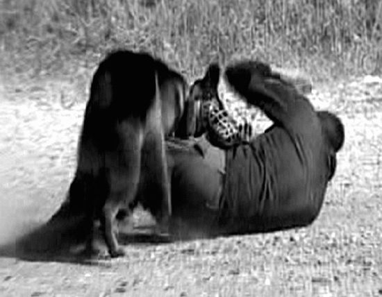 Само упражнение может служить хорошим вспомогательным этапом при доводке боевой собаки. По сути, человеческая плоть ничем не отличается от плоти животного. То же мясо, та же кровь, та же реакция на боль и укус. Опираясь на это, мы решаем задачу по приучению собаки атаковать живой организм. При этом, преследуя кошку или мышь, она видит перед собой добычу, меньшую по размерам и более слабую, а во время противостояния с лошадью или коровой ей надо подключать все свои внутренние резервы, чтобы обратить противника в бегство. Критики этого вида тренинга утверждают, что при его использовании может возникнуть проблема более сильной мотивации, нежели человек. Вот именно это утверждение и дает нам дальнейший путь коррекции поведения собаки. Когда ваш маленький солдат научится побеждать неприятелей животного происхождения, в десятки раз превосходящих его самого по размерам и весу, его начинают злобить и мотивировать исключительно на человека, давая понять, что только гомо сапиенс — настоящий враг. Процесс этот несложный, но мы сможем к этому времени дать собаке возможность поработать по живой, трепещущей плоти, ощутить вкус победы после укуса, наработать чувство уверенности — одним словом, плюсов гораздо больше, чем минусов. Я сам использовал такой способ неоднократно.