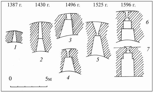 Типы бойниц крепостных башен: 1 — Малая башня в Порхове; 2 — Средняя башня в Порхове; 3, 4 — Воротная башня в Ивангороде; 5 — Гремячья башня в Пскове; 6, 7 — прясла Смоленского кремля