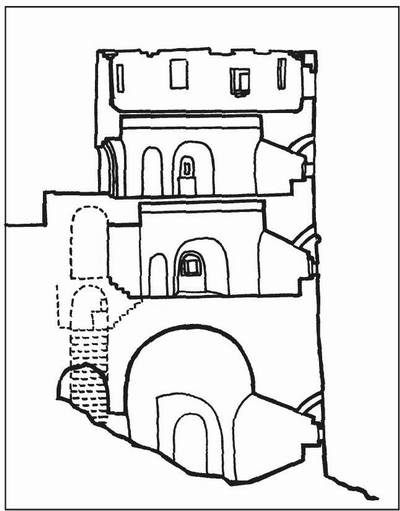 — въездная арка располагалась не на фасадной стороне башни, а на боковой; благодаря этому противник, приближаясь к воротам, оказывался обращенным правой, незащищенной стороной к крепостной стене;