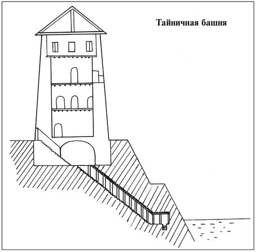 Тайники — подземные коридоры, которые вели к колодцу, — к концу XV в. обычно стали располагать так, что они выходили в одну из башен крепости, стоявшую ближе всего к реке. Поэтому во многих крепостях конца XV—XVI вв. можно встретить башню под названием Тайничная.