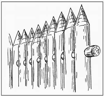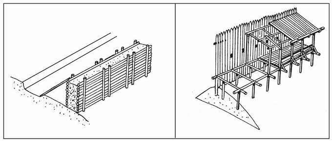Оборонительные стены: забор (слева) — Воргольское городище (IX в.); тын (справа) — Ярополч Залесский (XII в.). Рисунок по реконструкции Г.В. Борисевича
