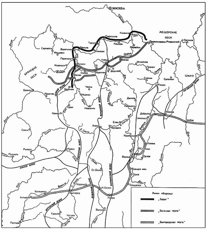 Оборонительные линии юга Руси XVI—XVII вв. и основные дороги (шляхи), по которым татары совершали набеги на Русь